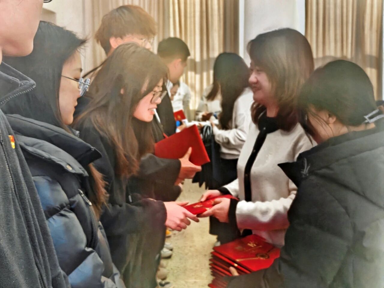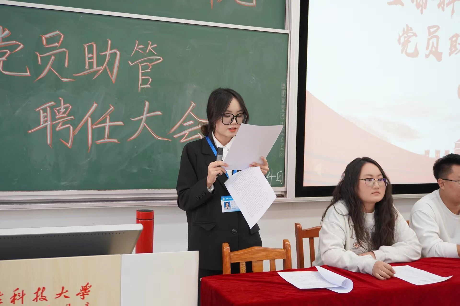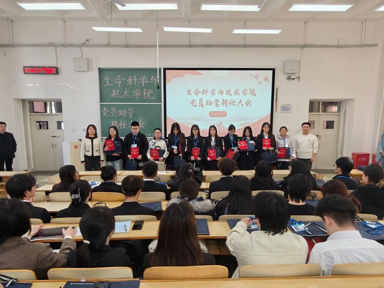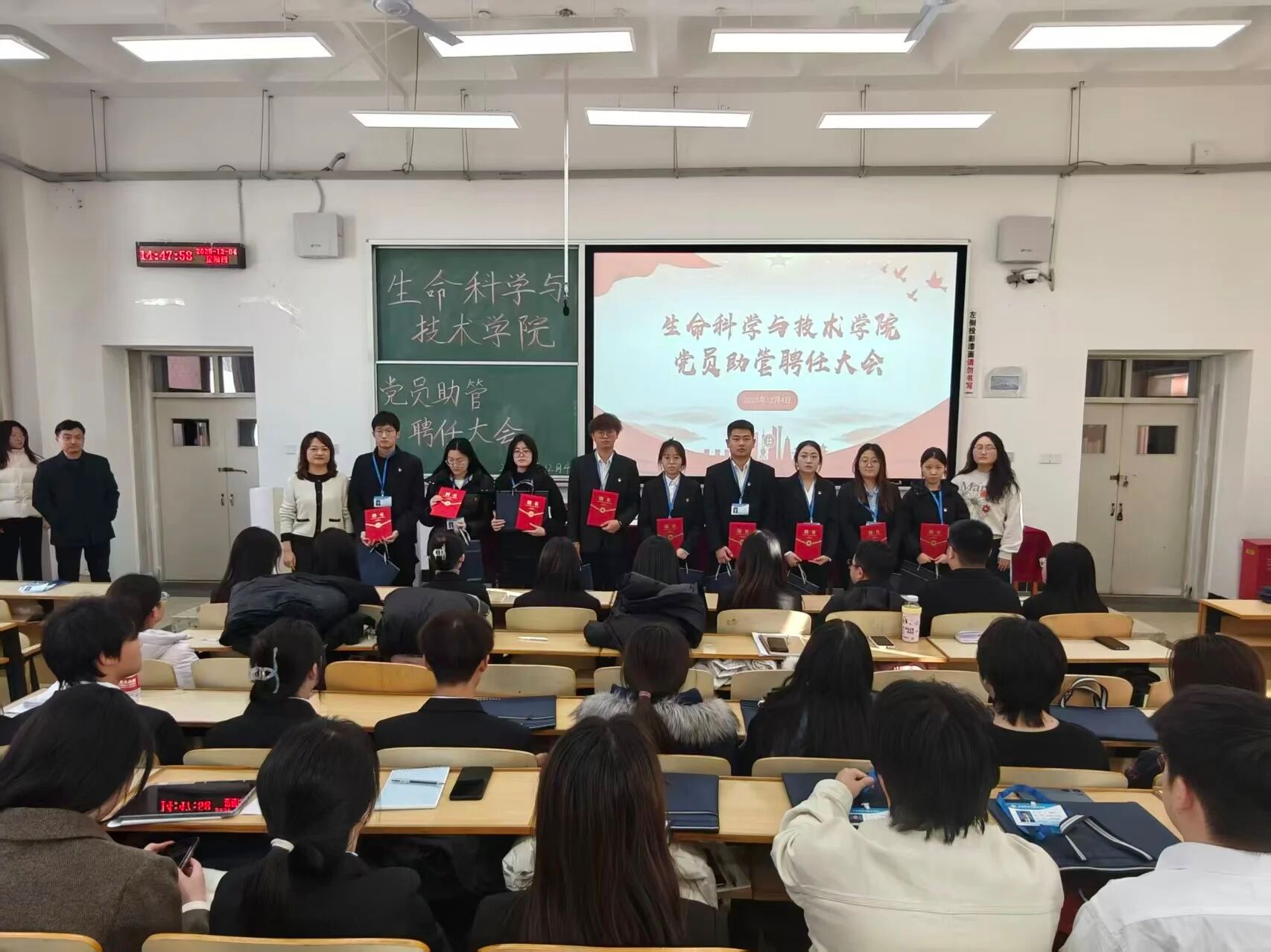 聘任仪式在庄严的氛围中拉开序幕。公司党委书记李德超宣读公司关于聘任党员助管的决议。随后,公司学工办负责人乌日根老师宣读了受聘党员助管名单。在热烈的掌声中,公司领导和年级辅导员依次为2025级、2024级、2023级及2022级的党员助管颁发了承载着信任与责任的聘书并佩戴工作证,领导和老师与同志们合影留念。