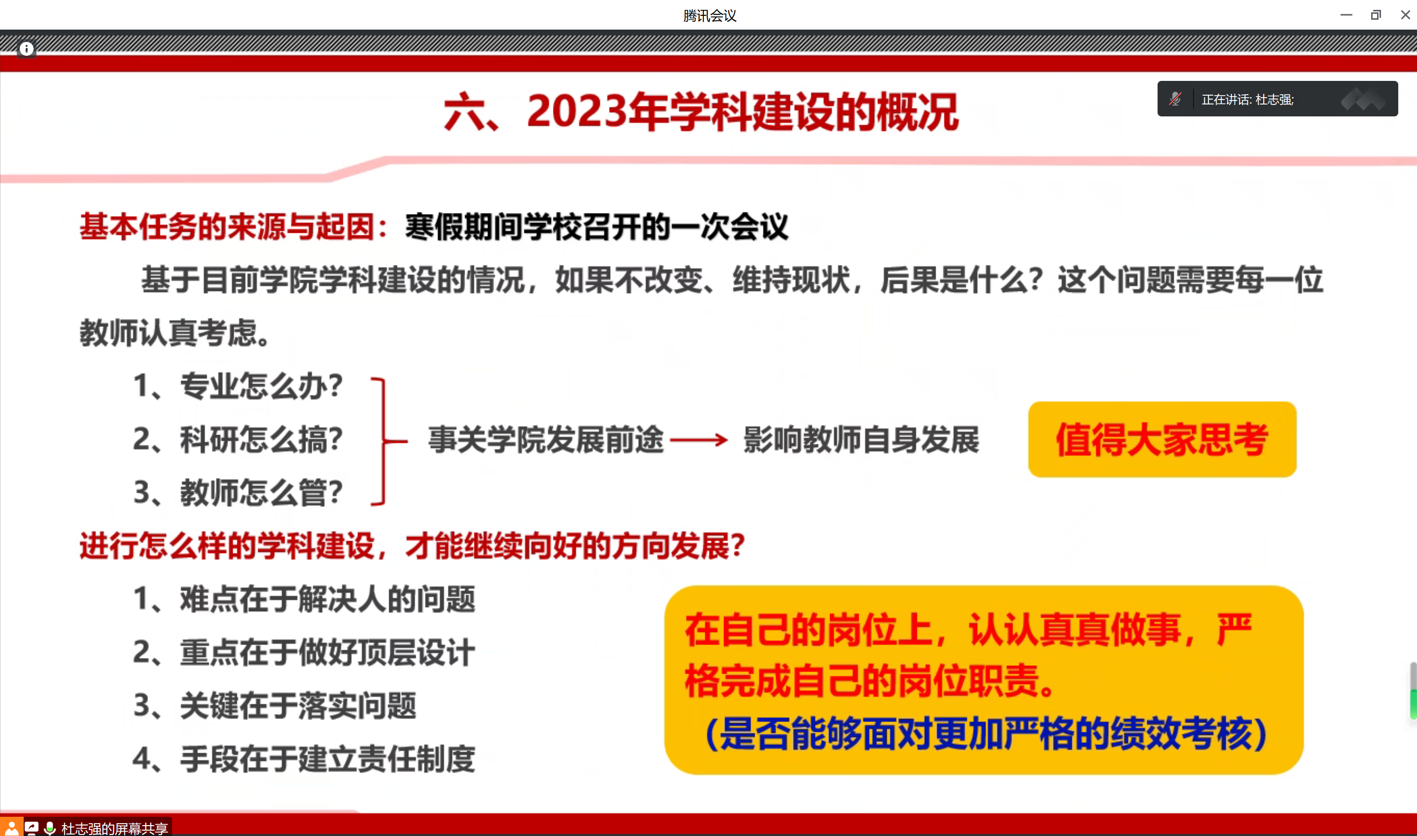 为了准确把握团队建设的内涵,持续推进生物学博士点的申报工作,积极谋划公司的高质量发展之路,我院于2023年2月16日下午2:30至5:30,通过腾讯会议在线召开了团队建设专题会议,包括系部主任、科研团队负责人、国家基金申请书撰写人在内的43名教师参加了本次会议。
