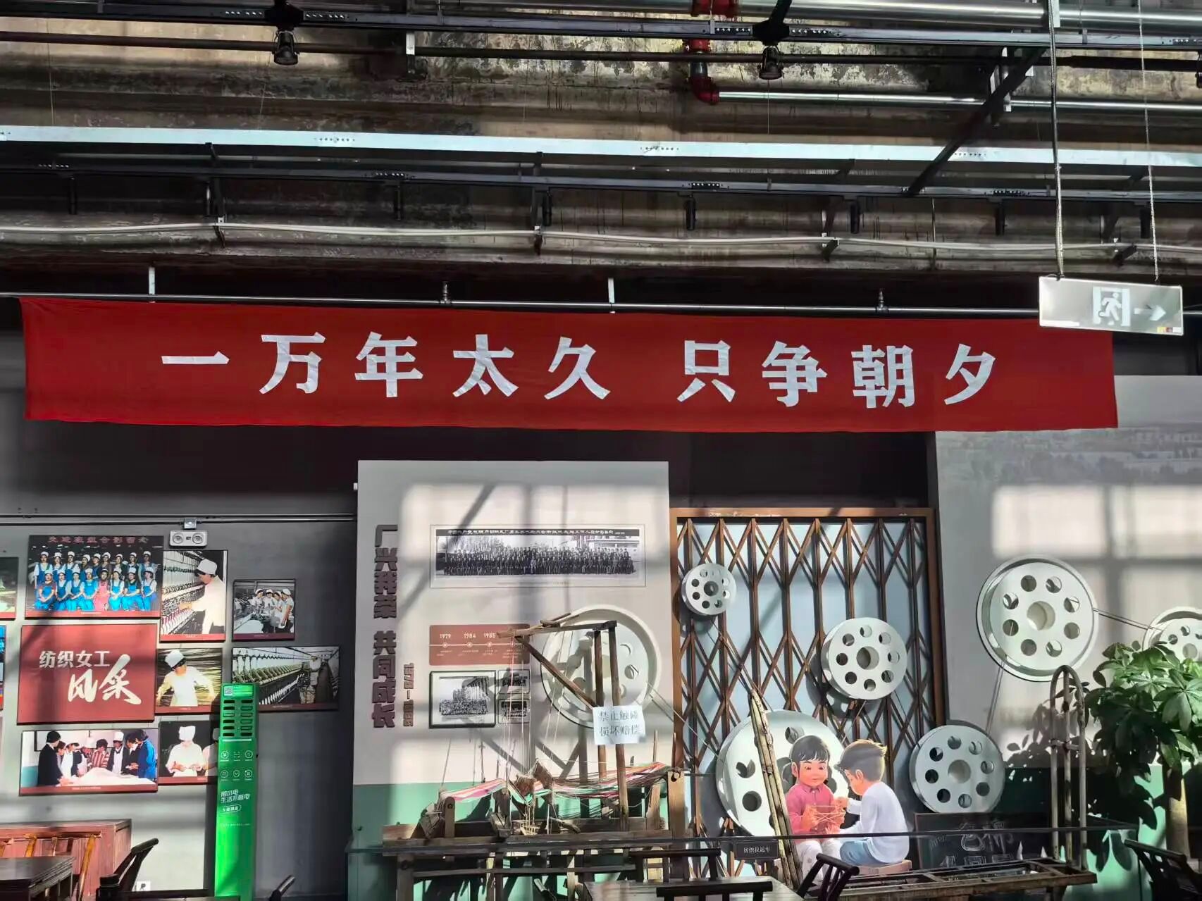 第二站支部来到“包棉1958主题街区”,在这里探寻红色印记,汲取奋进力量。斑驳的厂房、陈旧的纺织设备、珍贵的老照片,支部党员被这里深深吸引着,彼此谈论着,似乎自己置身于那个全民奋进年代,身临其境于包头棉纺厂从1958年建厂之初的艰苦创业,到发展成为亚洲最大棉纺织厂的辉煌历程。墙壁上的“一千年太久,只争朝夕”更是对青年员工的精神鼓舞与行为鞭策,包棉人融入DNA的艰苦奋斗、勇于创新的精神深深打动着每一位员工党员。这是一种勉励,一个方向,青年学子定当以知识为帆,创新为桨,在科学研究的征程上奋楫远航。
