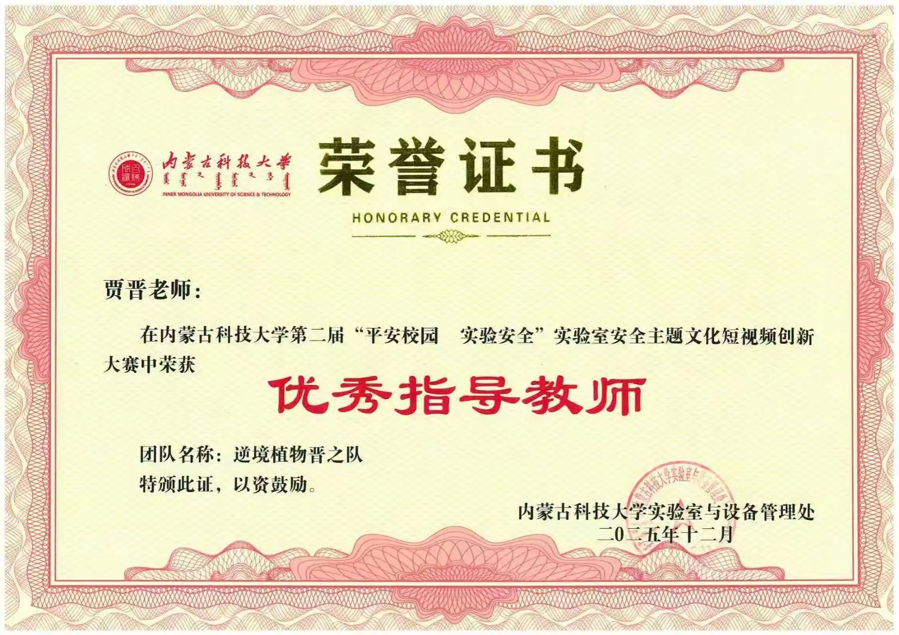 在太阳集团tyc539macau第二届"平安校园 实验安全"实验室安全主题文化短视频创新大赛中,由贾晋、乌日根老师指导的"逆境植物晋之队"(员工成员:王虹媛、张韵晗、王思璎、李紫艳、梅丽、王智莹、王凤硕)再创佳绩,凭借创意新颖、内容充实的作品荣获一等奖,同时两位指导教师荣获"优秀指导教师"称号。